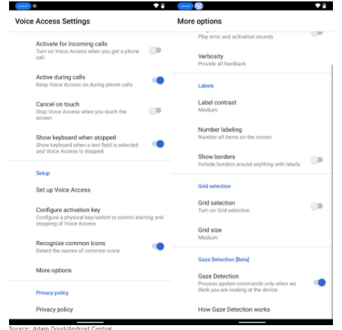 Gaze Detection هي ميزة جديدة موجودة ضمن خيارات Voice Access على هاتف Android الخاص بك والتي ظهرت لأول مرة خلال الصيف في مؤتمر Google I / O، وعند تفعيل هذه الميّزة فإنّ الهاتف يستخدم الكاميرا الأمامية لتحديد ما إذا كنت تنظر إلى الهاتف قبل السماح لك بالتحكم في الهاتف صوتيًا.
