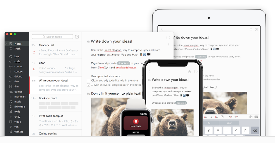 يعتبر التطبيق مناسبًا للمستخدمين الذين يحتاجون مجرّد قائمة يومية يقومون بكتابتها بشكل يومي. و باستخدام الإصدار المجاني من Bear يمكنك إنشاء ملاحظات وإضافة علامات ومرفقات وتصدير الملاحظات بصيغ مختلفة، ما يميّز هذا التطبيق عن غيره هو بساطته الفائقة وسهولة استخدامه، كما أنه يتكامل بشكل مميّز مع Siri حيث يمكنك أن تطلب من Siri إنشاء ملاحظة جديدة في Bear بشكل مباشر، التطبيق متوفّر على نظام iPhone فقط.