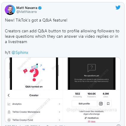 طرحت TikTok ميزة جديدة تجعل من السهل على بعض مستخدمينها المبدعين الأكثر شعبية باستضافة جلسات Q&A (أسئلة وأجوبة) مع معجبيهم. وتم رصد هذه الميزة لأول مرة عندما قام مستشار وسائل االتواصل الاجتماعية (مات نافارا) بمشاركة صوراً لها على حسابه على تويتر. هذه الميزة متاحة للأشخاص الذين لديهم 10000 متابع فقط.