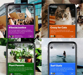 أيضاً أعلنت شبكة Twitter عن ميزة أخرى تعرف بميزة المجتمعات “Communities”، والتي طورت لمنافسة ميزة Facebook Groups، حيث يمكن للمستخدمين إنشاء مجموعات تتوافق مع إهتماماتهم، كما يقدم Twitter إقتراحات للمستخدمين لمتابعة المزيد من التغريدات.
