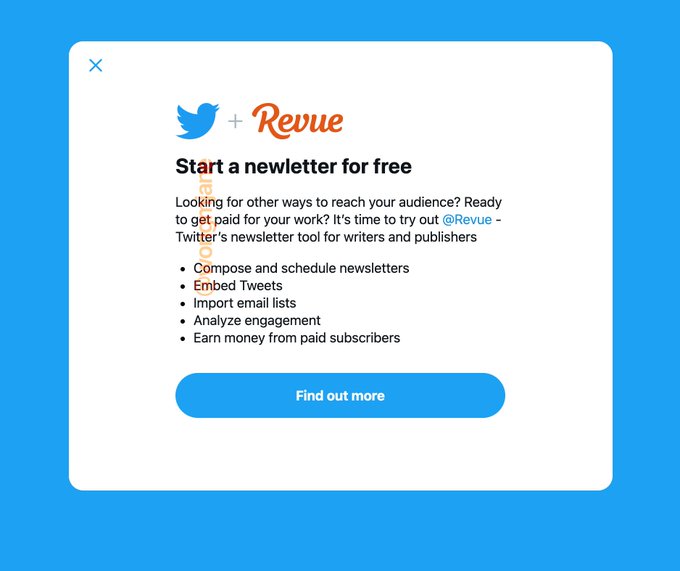 ويعيد في الوقت الحالي زر اكتشف المزيد “Find Out More” في الرسالة المنبثقة توجيه مستخدميTwitter إلى موقع Revue عبر الويب.