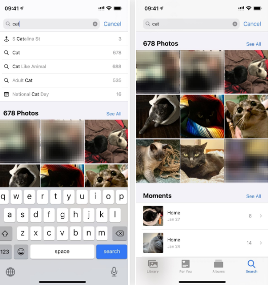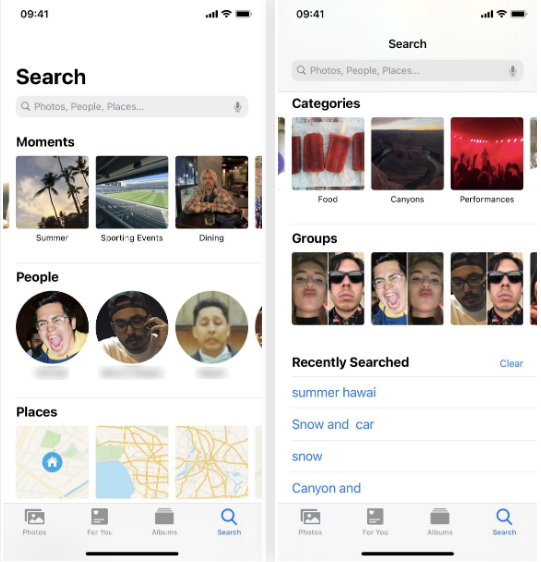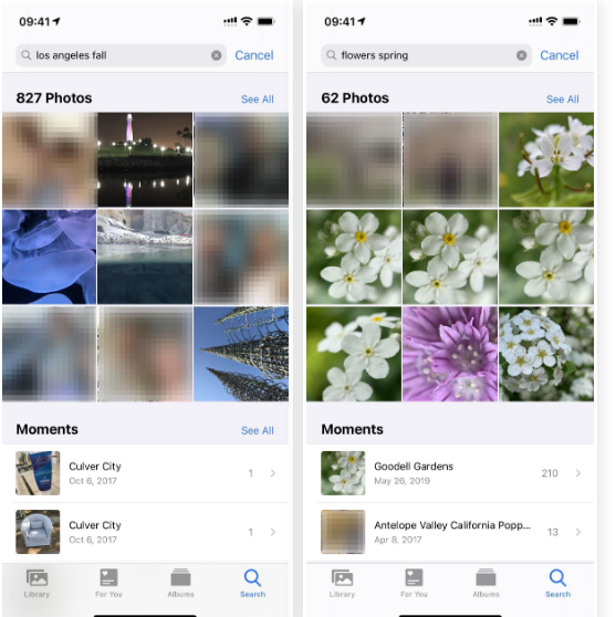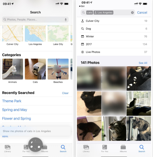 إضافًة إلى البحث اليدوي أصبح بإمكانك البحث عن صورة معيّنة من بين آلاف الصور بسرعة كبيرة بمساعدة Siri وسيقوم بإنجاز المهمة كما لو كنت ستفعلها بنفسك، فإن كنت ترغب بالبحث عن صور الأزهار التي قمت بالتقاطها في الربيع الفائت يكفي أن تقوم بتشغيل Siri وتقول Show me photos of flowers from the last spring وهو سيقوم بإتمام المهمّة بدلًا منك ويجلب الصور التي تبحث عنها.