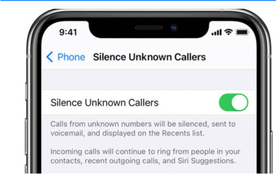 ببساطة عن طريق حظر المكالمات يمكن لمستخدمي Apple iPhone إيقاف المكالمات غير المرغوب بها، تتوفّر في iOS 13 والإصدارات الأحدث ميّزة Silence Unknown Callers والتي تعمل على حظر أرقام الهواتف التي لم تتصل بالمستخدم من قبل ولم يتم حفظها في قائمة جهات الاتصال، لتشغيل هذه الميّزة انتقل إلى تطبيق الإعدادات وانتقل إلى “الهاتف”، ثم مرّر إلى الأسفل وانقر على “إسكات المتصلين غير المعروفين” وشغّل الميزة.
