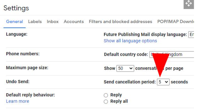 إذا كانت الثواني الخمس الافتراضية أقصر من أن تتمكن من استعادة بريدك الإلكتروني بسرعة، فيمكنك تمديد فترة الإلغاء حتى 30 ثانية.