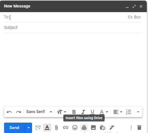 • انقر فوق أيقونة “Insert files using Drive” في شريط الأدوات السفلي لرسالة Gmail.