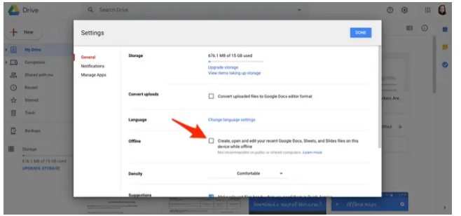 - في قسم “بلا اتصال” حدد المربع بجوار Create, open and edit your recent Google Docs, Sheets and Slides files on this device while offline.