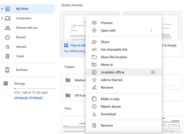 - لتنزيل ملفات محددة والتعديل عليها في حال عدم الاتصال، توجّه إلى صفحة محرر مستندات Google الرئيسية وانقر بزر الماوس الأيمن فوق أي ملف ثم اضغط على Available offline.