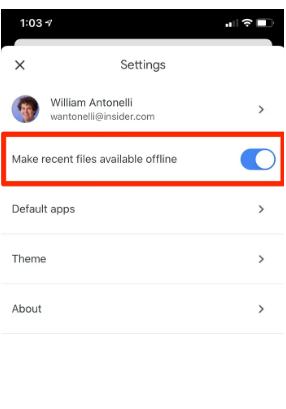 الآن عندما تستخدم الهاتف دون وجود اتصال يمكنك ببساطة فتح تطبيق Drive والنقر على القائمة الموجودة في الزاوية العلوية اليسرى ثم النقر على Offline وستظهر لك جميع الملفات التي يمكنك تحريرها في وضع عدم الاتصال.