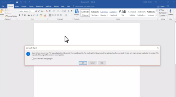 - يخبرك Word أنه سيقوم بإنشاء نسخة من ملف PDF وتحويل محتوياته إلى تنسيق يمكن لـ Word عرضه، وفي هذه المرحلة لن يتم تغيير ملف PDF الأصلي على الإطلاق، وعليك النقر هنا على موافق.