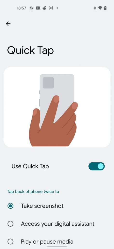 قدّمت جوجل لهواتفها الأخيرة Pixel 5 حزمةً لا بأس بها من الإيماءات الجديدة مع ورود النظام Android 12، وقد تضمّن ذلك إيماءات النقر الخلفي أو ما يدعى بالنقر السريع والتي تحتاج إلى بعض النقرات على الغلاف الخلفيّ من الهاتف لكي تقوم بوظائفها المخصصة.