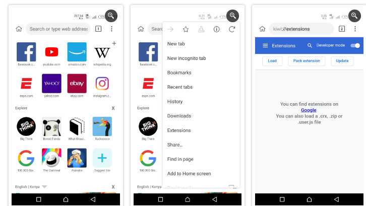 في الحقيقة لا يمكننا تحميل الملحقات على المتصفّح الذي نستخدمه مباشرًة وإنّما نحن بحاجة لتحميل متصفّح آخر يدعم هذا النوع من الملحقات لذا سنحاول شرح كيفية القيام بذلك على متصفّح Kiwi.