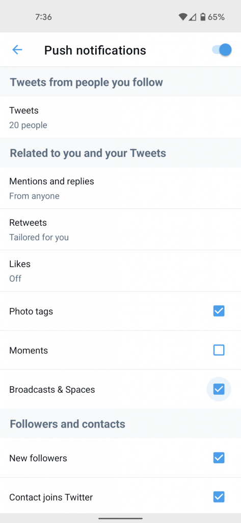 ستظهر لدينا ضمن خيارات الإلغاء كافة الطرق التي يقوم بها تويتر لإرسال الإشعارات إلى هواتفنا الشخصية وضمن العنوان تغريداتك وإعداداتك الخاصة سنجد مربعاً للتحديد إلى جانب خيار Broadcasts & Spaces ومع إلغاء تحديد الخيار سيتم إلغاء تفعيل الإشعارات الخاصة بالخدمة Twitter Spaces، وعمليات البثّ المباشر، كما يمكننا اتباع الطريقة ذاتها في إلغاء الإشعارات الخاصة في بقية الخدمات.