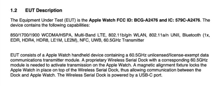 تم تزويد Apple Watch Series 7 بوحدة جديدة تتيح نقل البيانات لاسلكيًا بسرعة 60.5 جيجاهرتز، ولكن قد تكون هذه الميّزة مخصّصة في الوقت الحالي لموظّفي الشركة فقط، تشير التقارير إلى أن السرعة الجديدة 60.5 جيجاهرتز لا يتم تنشيطها إلا عند وضع Apple Watch على جزء خارجي يشبه القاعدة وهو جزء إضافي وذلك للتحكّم بهذه السرعة الكبيرة، ولكن حتى الآن لم تقم الشركة بالإعلان عن أي تفاصيل تتعلّق بنشر هذه الميّزة، من المحتمل أن يتمكّن المستخدمين من شراء القاعدة بشكل مستقل في حال قامت الشركة بتوفير ذلك للجميع، تحمل القاعدة الخاصّة بالساعة رقم الموديل A2687 ويتم تشغيلها بواسطة منفذ USB-C، وفي الأسفل بعض التفاصيل التقنية حول هذا الجزء الإضافي.