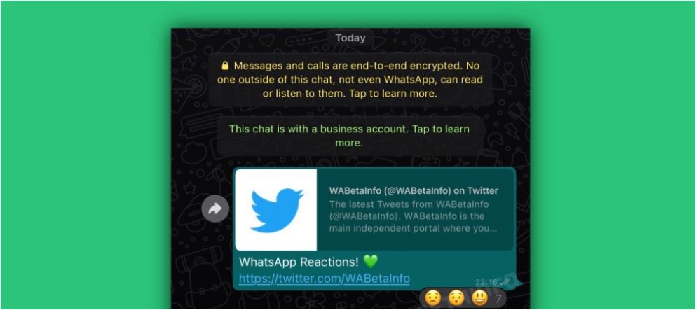مرّ أسبوعين تقريباً على كشف التقارير لأفكار واتساب في العمل على تأمين ميزة التفاعل مع الرسائل، ولا زالت هذه الميزة قيد التطوير حتى الآن ولهذا فإنها لم تظهر بعد في النسخة التجريبية التي تمكّن بعض المستخدمين من تحميلها، ومن المرجّح لميزة واتساب الجديدة أن تتشابه مع الميزة النظيرة من إنستجرام، ويعني ذلك بأنه من الممكن استخدام أي رمزٍ تعبيريٍّ كان للتفاعل مع الرسالة.
