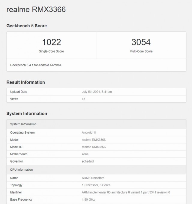 منحت كوالكوم اسم “Kona” إلى شرائح المعالجة Snapdragon 865 وما يخلفها أيضاً مثل 865+ و870، كما وضّحت قائمة Geekbench بأن ريلمي قد أرفقت هاتفها الأخير ذي الرقم RMX3366 بذاكرةٍ عشوائيةٍ تبلغ سعتها 12 جيجابايت.